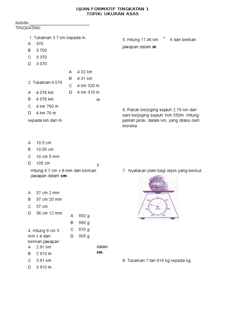 Ujian Formatif Tingkatan 1 Topik Ukuran Asas