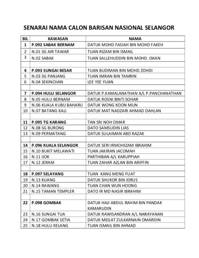 Pru14 Senarai Penuh Calon Bn Selangor